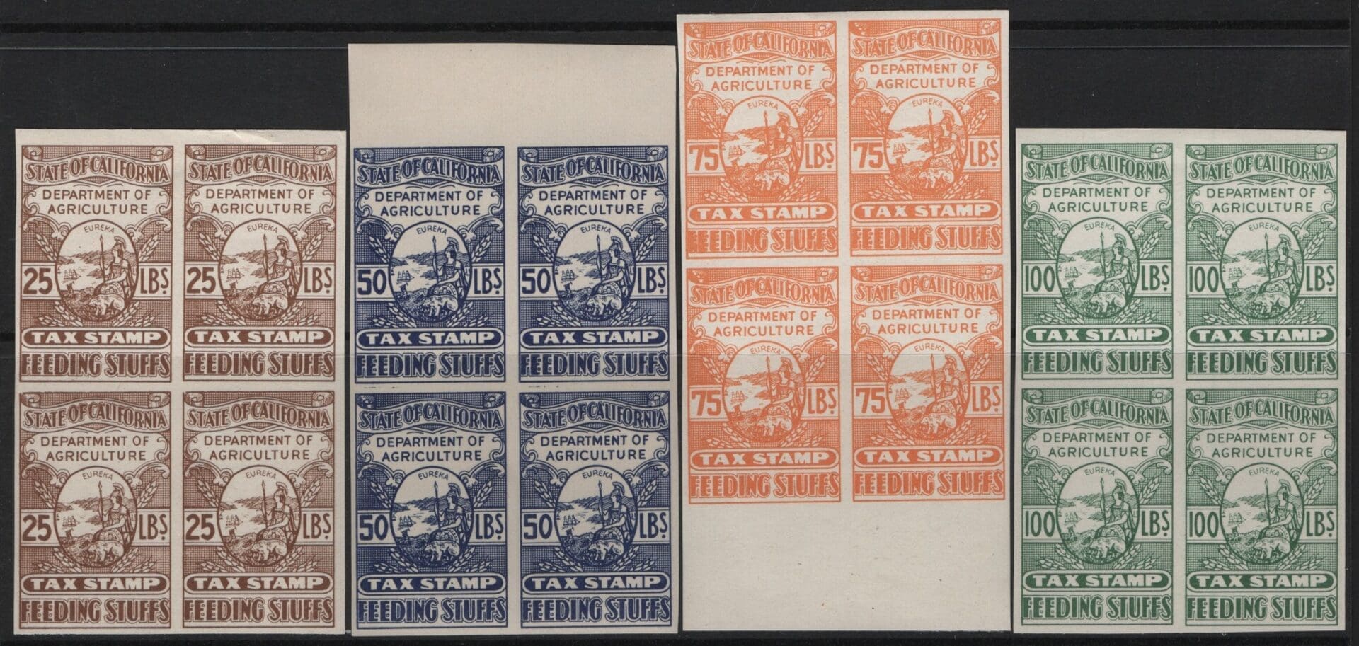 MNH STATE REVENUE IMPERF BLOCKS OF (4) 25LBs, 50LBs, 75LBs & 100 LBs, PRISTINE GUM, NICELY CENTERED