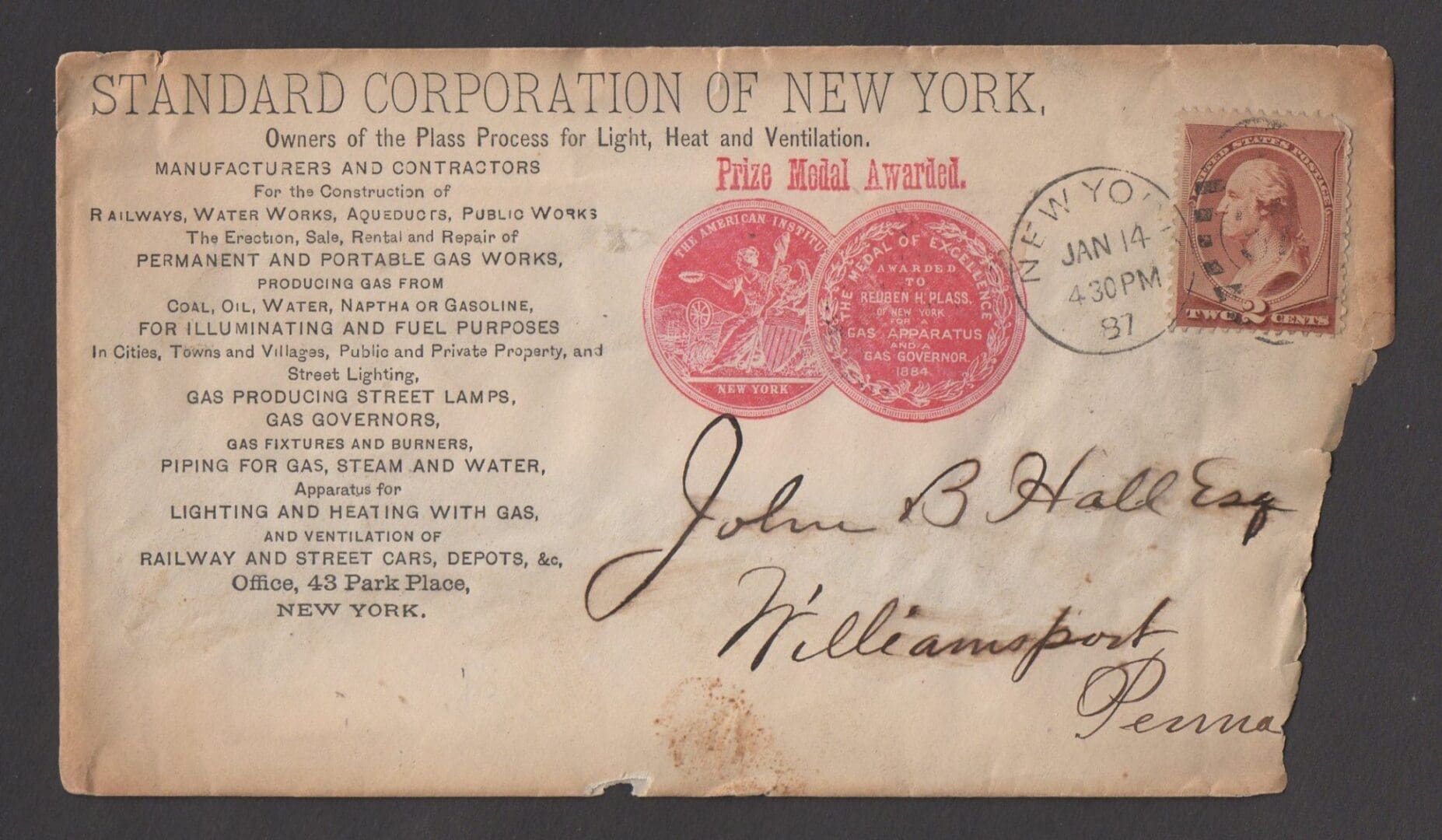VERY INTERESTING ADVERTISING COVER SADLY HAS SEEN BETTER DAYS BUT STILL A PART OF HISTORY WITH A SCOTT# 210 AND A NEW YORK CIRCLE DATE STAMP JAN 14th 1887 4:30PM ON FRONT AND A WILLIAMSPORT PA RLCD CDS JAN 15th 8AM ON THE BACK