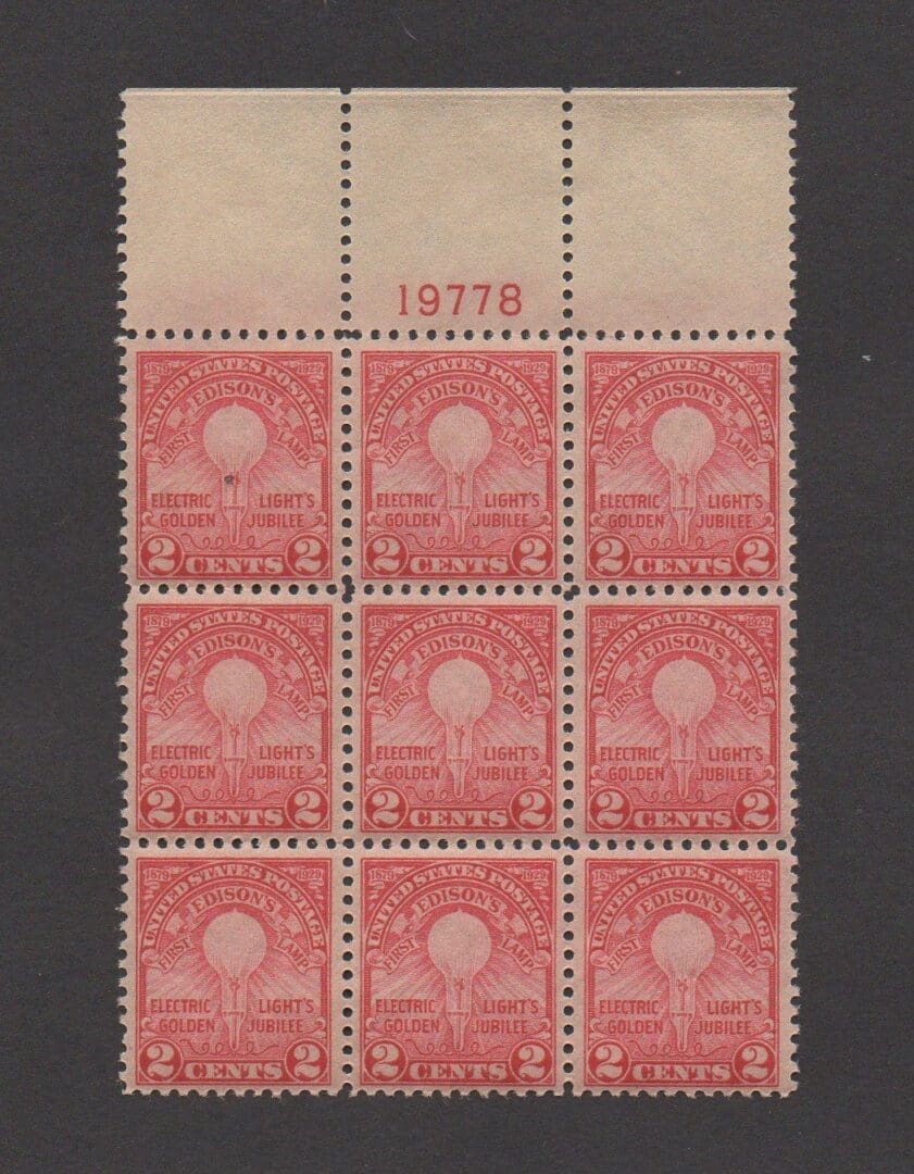 Scott# 654 “EDISON LAMP”PLATE BLOCK (9) MNH, VERY NICELY CENTERED