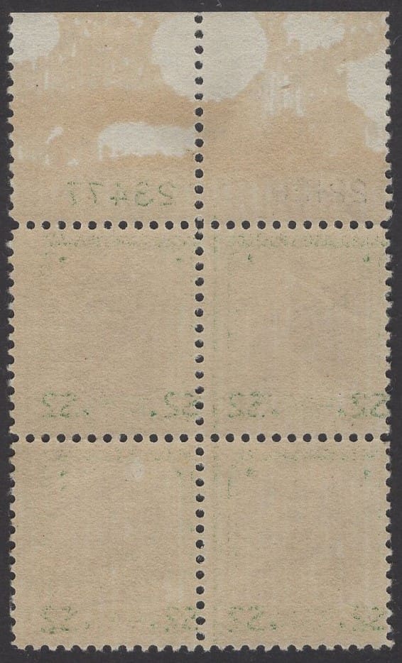 MNH PLATE BLOCK (4) WITH “F” MARGINAL MARKINGS WITH TYPICAL GUM SKIPS/BENDS IN THE TOP SELVAGE ONLY