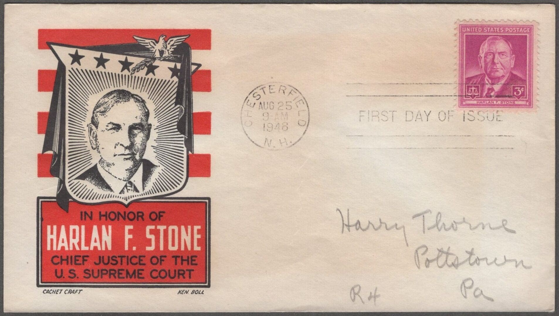 KEN BOLL FIRST DAY COVER WITH CHESTERFIELD N.H. CDS