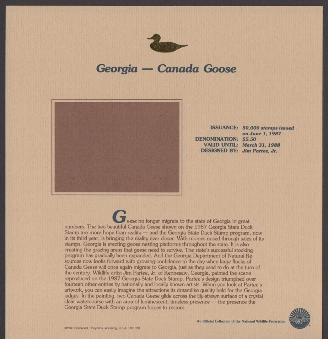 MNH GEORGIA STATE DUCK STAMP ON FLEETWOOD COLLECTORS PAGE SUITABLE FOR FRAMING