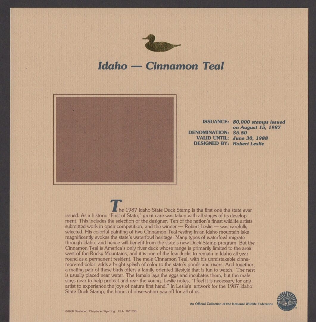 MNH IDAHO STATE DUCK STAMP ON FLEETWOOD COLLECTORS PAGE SUITABLE FOR FRAMING