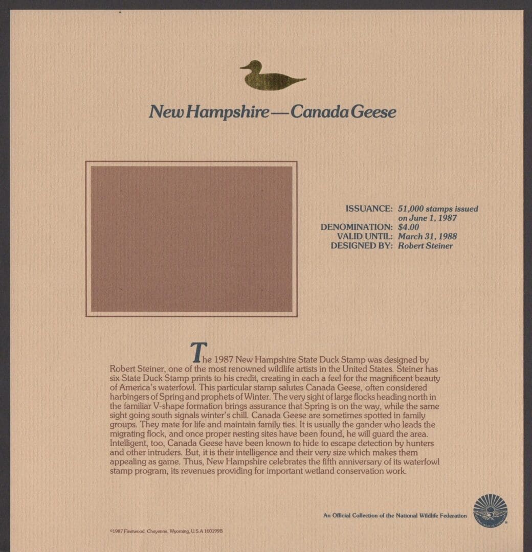 MNH NEW HAMPSHIRE STATE DUCK STAMP ON FLEETWOOD COLLECTORS PAGE SUITABLE FOR FRAMING