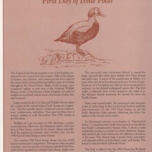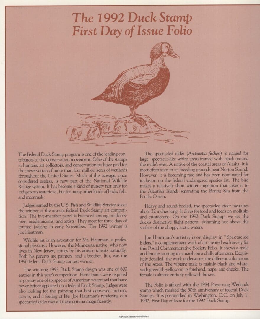 POSTAL COMMEMORATIVE SOCIETY FOLIO PAGES FOR THIS 1992 DESIGN WHICH INCLUDES THE HISTORY ALONG WITH A MNH EXAMPLE AND THE FIRST DAY CANCEL WITH ADDED STAMPS